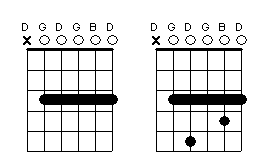 Un bon exercice : testez ces deux accords en réalisant le barré en 5ème puis en 3ème case.
